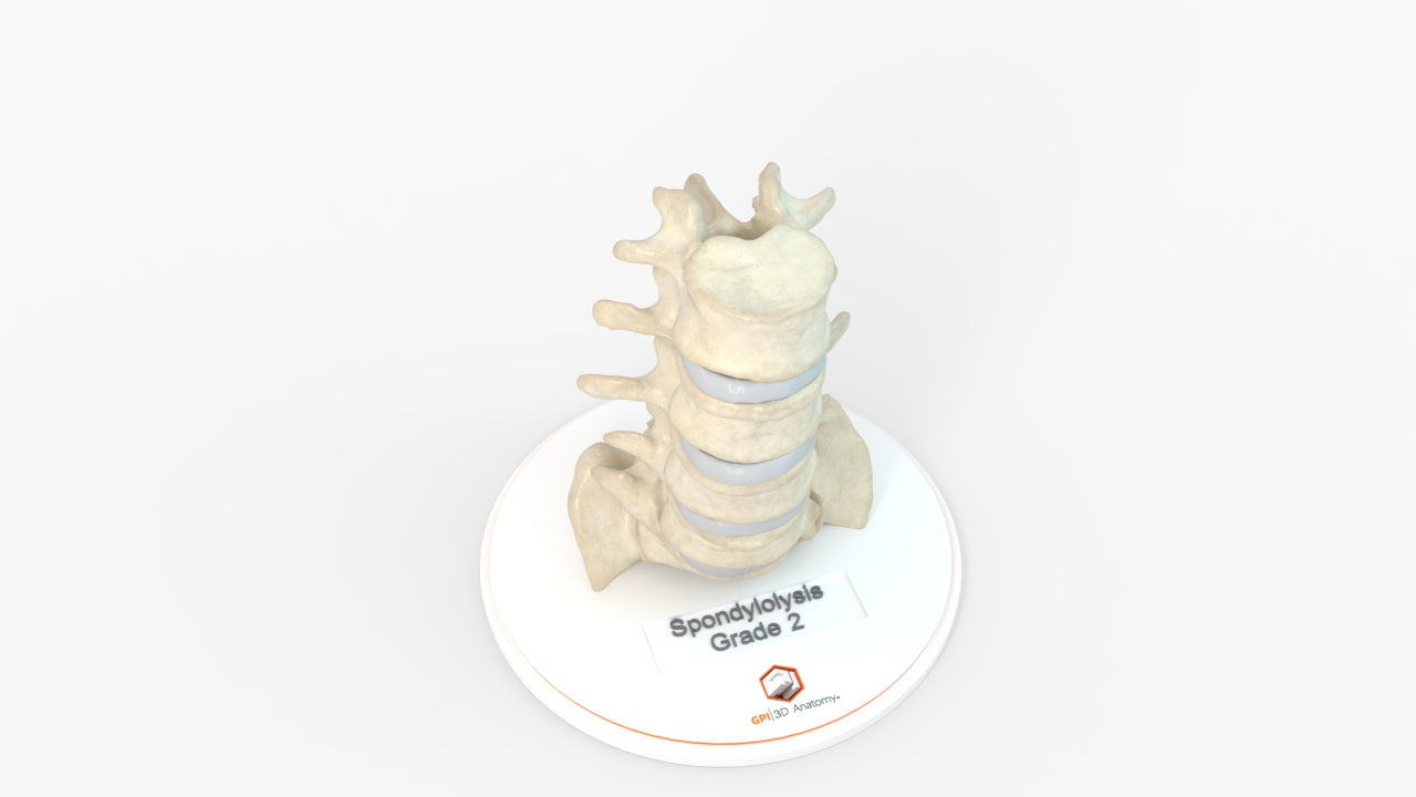 Grade 2 bilateral spondylolysis, a defect in the pars interarticularis of the posterior vertebral arch. A common cause of axial back pain in adolescents, especially young athletes, the defect typically occurs in the lumbar spine, most often at L5.
