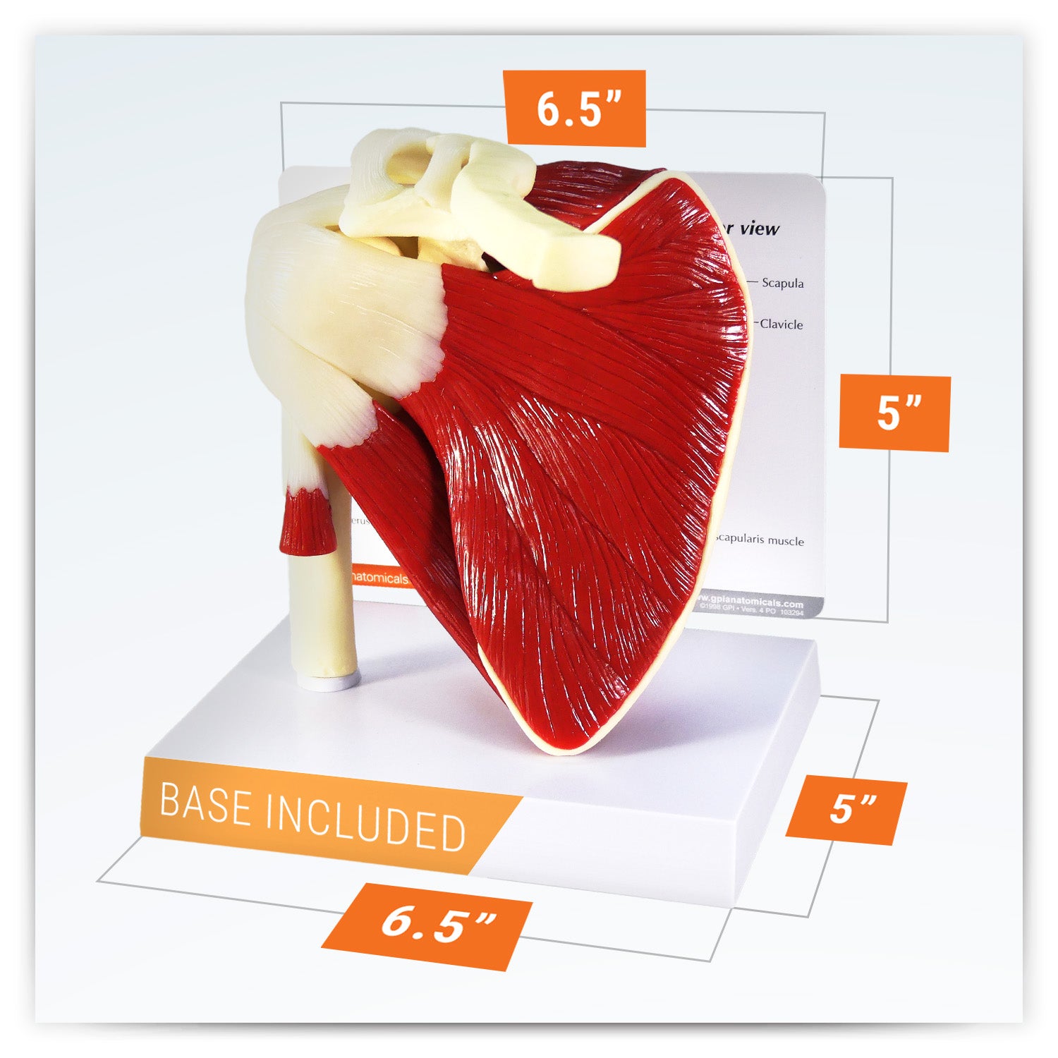 Model is of a full size normal right shoulder with muscles attached. It includes: infraspinatus, subscapularis, supraspinatus, & teres major & minor muscles; acromion, clavicle, humerus & scapula bones; plus eight ligaments & tendons. This model is non-articulating. This product contains a model, an informational card, and display base. Our models are great for doctor's offices and healthcare facilities.