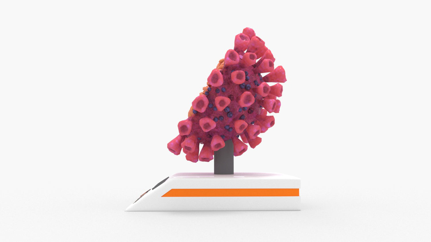 SARS-CoV-2, a single-stranded RNA virus, with spike proteins, nucleocapsid, membrane and envelope. Full and half molecule available.