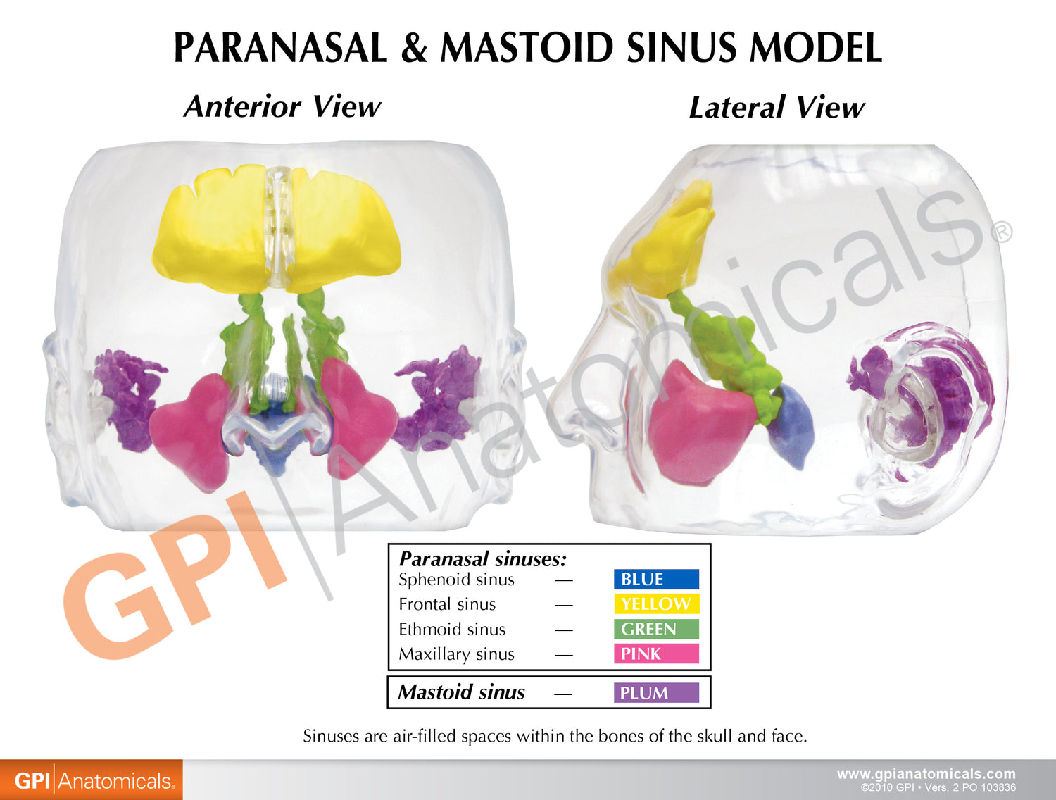 Model is of a life size clear face for orientation focusing on the sinus cavities. It includes the sphenoid, frontal, ethmoid, maxillary, & mastoid sinuses. Distinct colors are used to differentiate between the sinuses. This product contains a model & an informational card. The full size of the model measures 7” x 5-1/2” x 5”. The size of the card measures 8-1/4” x 6-1/4”. Our model is great for doctor's offices and healthcare facilities.