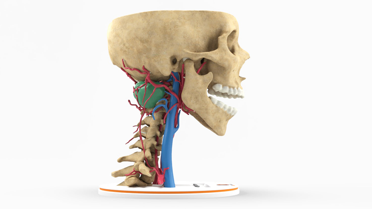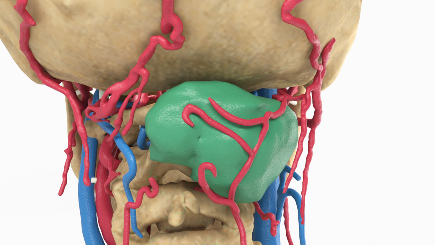 The model was created by combining MRI and CT scans of the cervical spine for preoperative planning and patient education. A realistic texture was applied to the bones and the vasculature, ending in a highly detailed representation of a sarcoma (green) located in the posterior cervical spine, aiding in a realistic 3D representation.