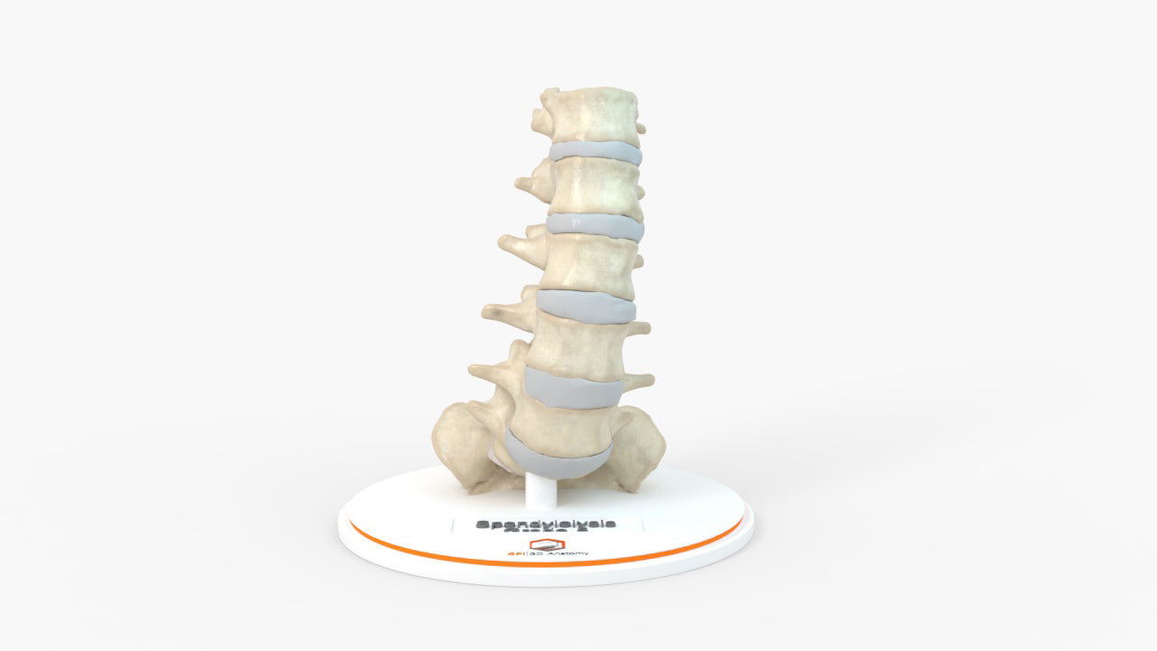 Grade 5 spondylolisthesis, a defect in the pars interarticularis of the posterior vertebral arch. A common cause of axial back pain in adolescents, especially young athletes, the defect typically occurs in the lumbar spine, most often at L5.