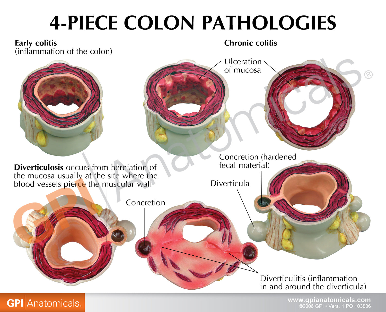 Model of four-piece cross-section of the colon depicting both normal & various disease conditions. Included in normal anatomy is serosa, muscle, taenia, & more. Diseases represented are polyps, cancer, colitis, & diverticulitis. This product contains a model & an informational card. The full size of the model measures 3-5/8” x 1-1/2” x 1-7/8”. The size of the card measures 6-1/2” x 5-1/4”. Our model is great for doctor's offices and healthcare facilities.