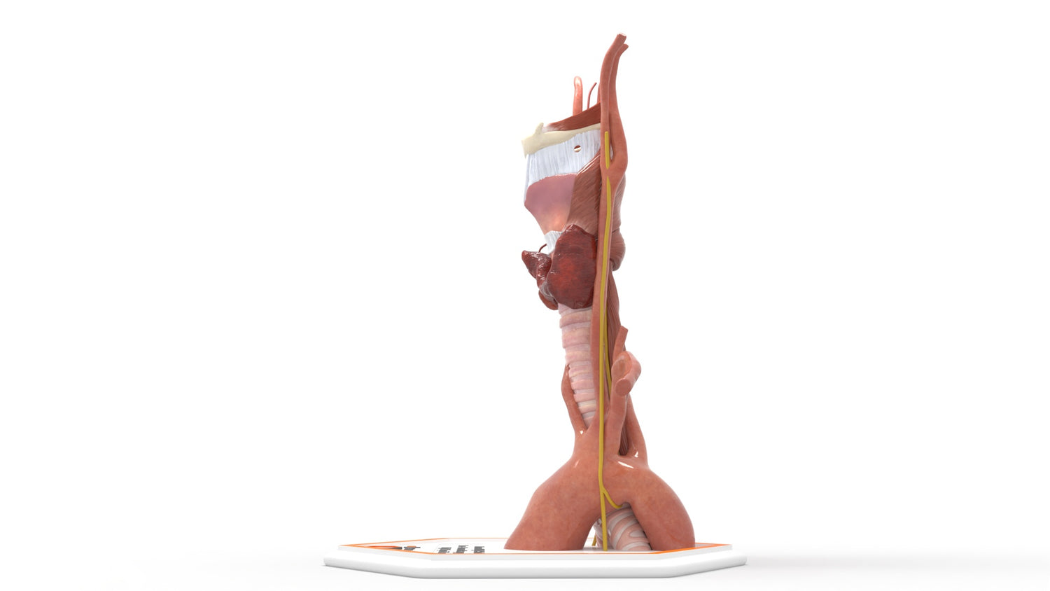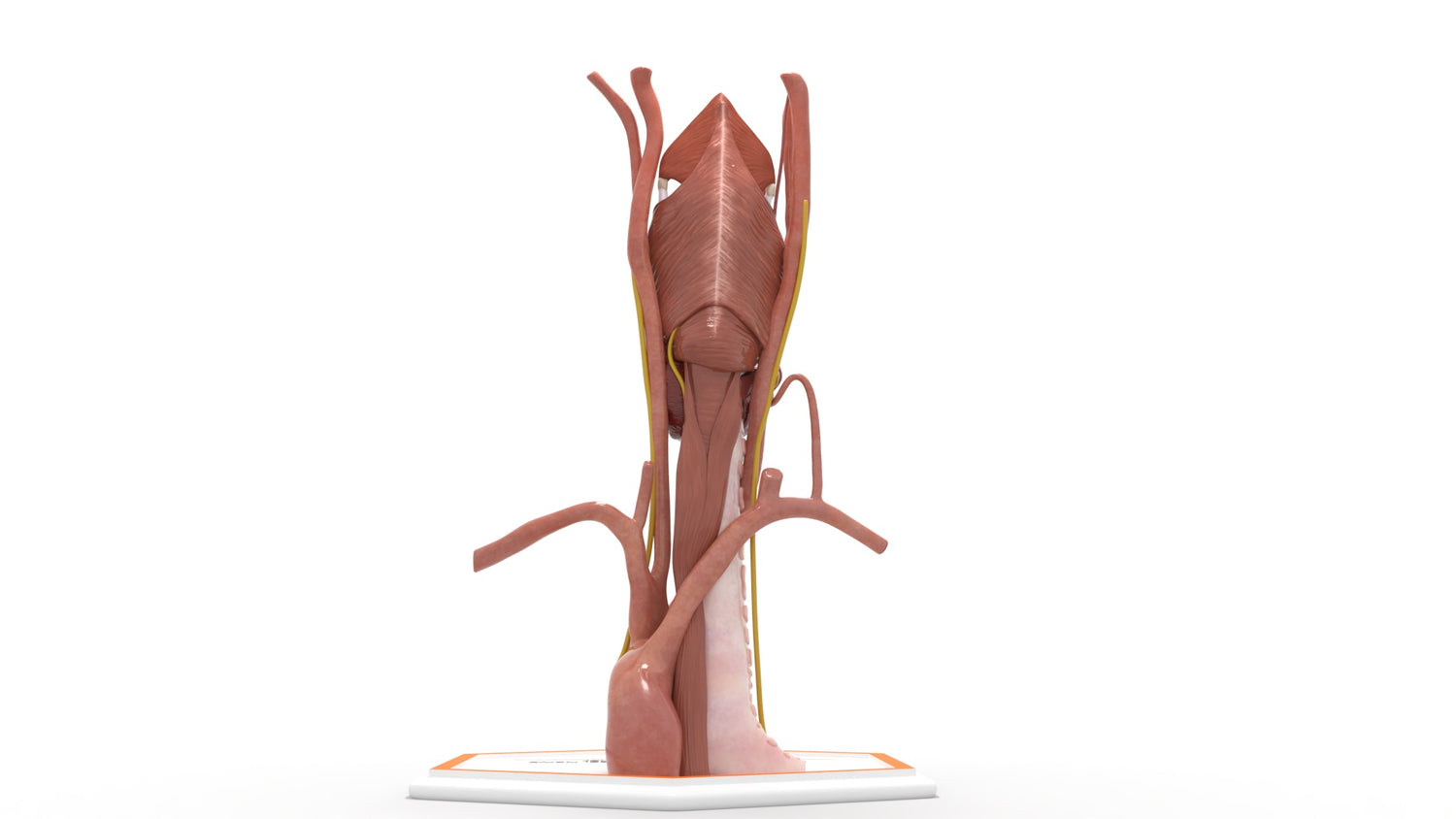 On the left, the recurrent laryngeal nerve still branches anterior to the aortic arch, looping posterior to the ligamentum arteriosum and arch before ascending in the same tracheoesophageal groove. Both sides enter the larynx deep into the inferior constrictor at the level of the cricothyroid joint. The left recurrent laryngeal nerve, and in this case right non-recurrent laryngeal nerve, provides motor innervation to all intrinsic laryngeal muscles except the cricothyroid muscle and sensory innervation to the mucosa below the vocal folds, cervical trachea, and upper esophagus.