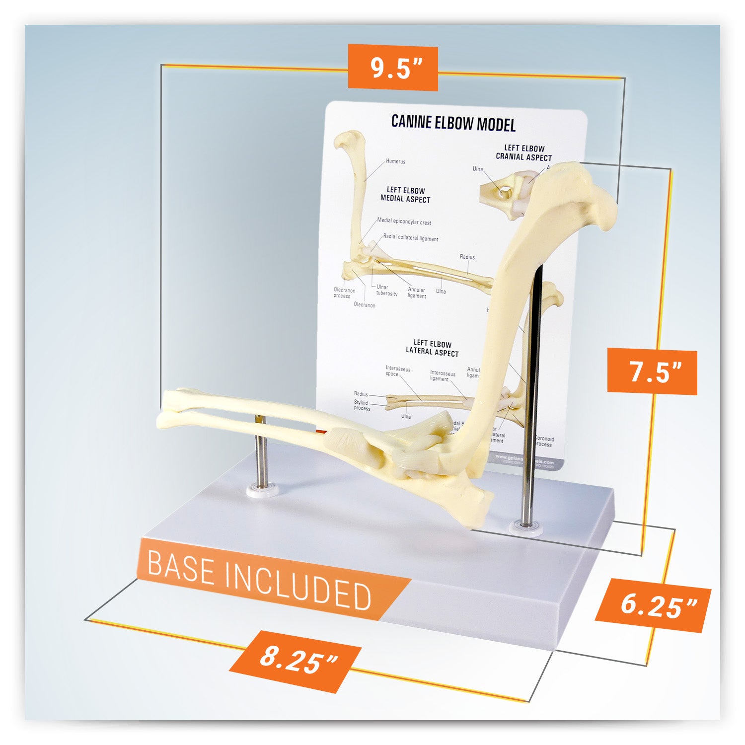 Model is of a healthy, average size, left canine elbow. It includes the humerus, radius, ulna, plus six ligaments. This model is non-articulating. This product contains a model, an informational card, & display base. The full size of the model measures 9-1/2” x 1-3/4” x 7-1/2”. The size of the card measures 6-1/4” x 8-1/4”. The size of the base measures 8-7/8” x 6-1/4”. Our model is great for veterinarian offices and classroom settings.