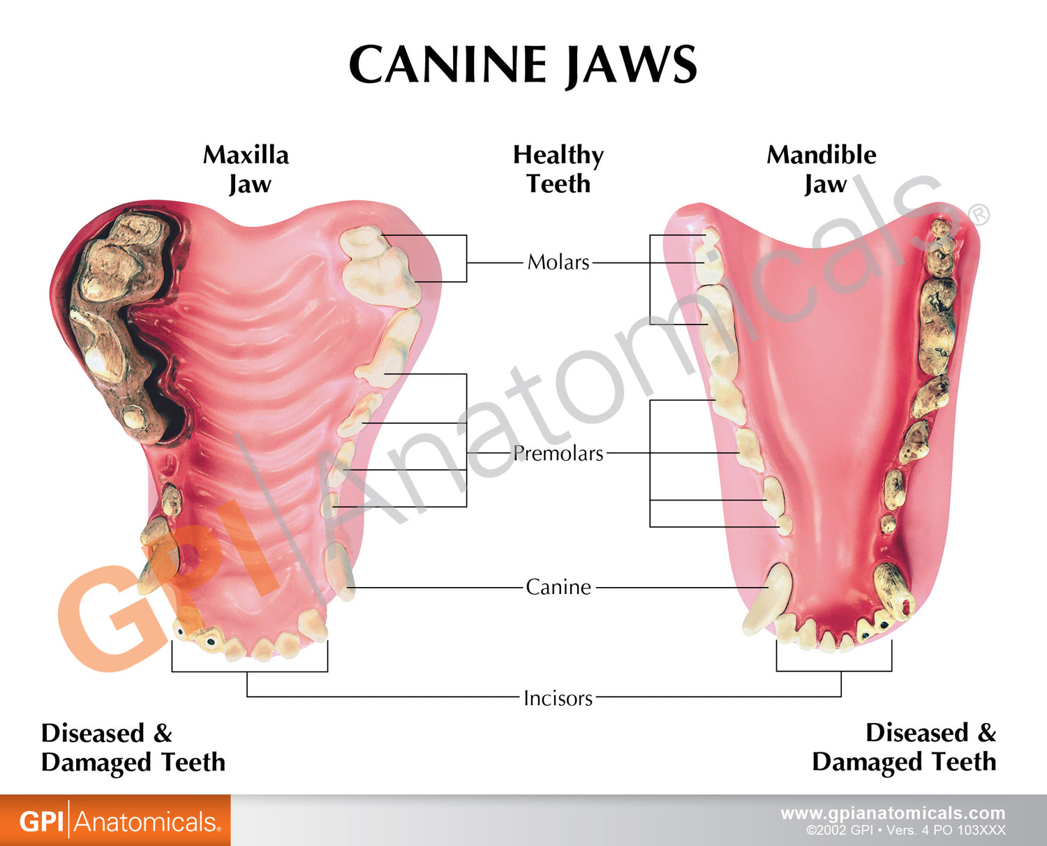 Model is an average size canine jaw showing healthy teeth on right side with diseased & damaged teeth on left side. Featured pathologies include fractured canine, periodontal disease, tartar accumulation, plaque, gingivitis, & more. This product contains a model & an informational card. Our model is great for veterinarian offices and classroom settings.
