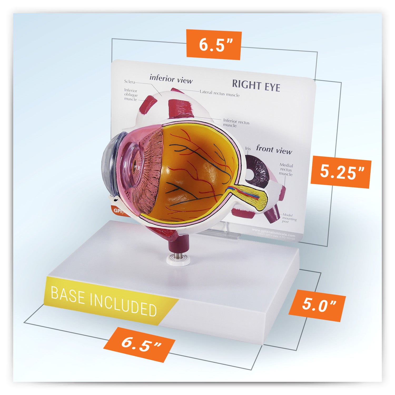 Model is of an oversized eye with split shell construction to allow for the viewing of the inner anatomy. This includes the optic nerve, disc, macula, retina, central retinal artery & vein. The lens and cornea are removable. This product contains a model, an informational card, and display base. Our model is great for doctor's offices and healthcare facilities.