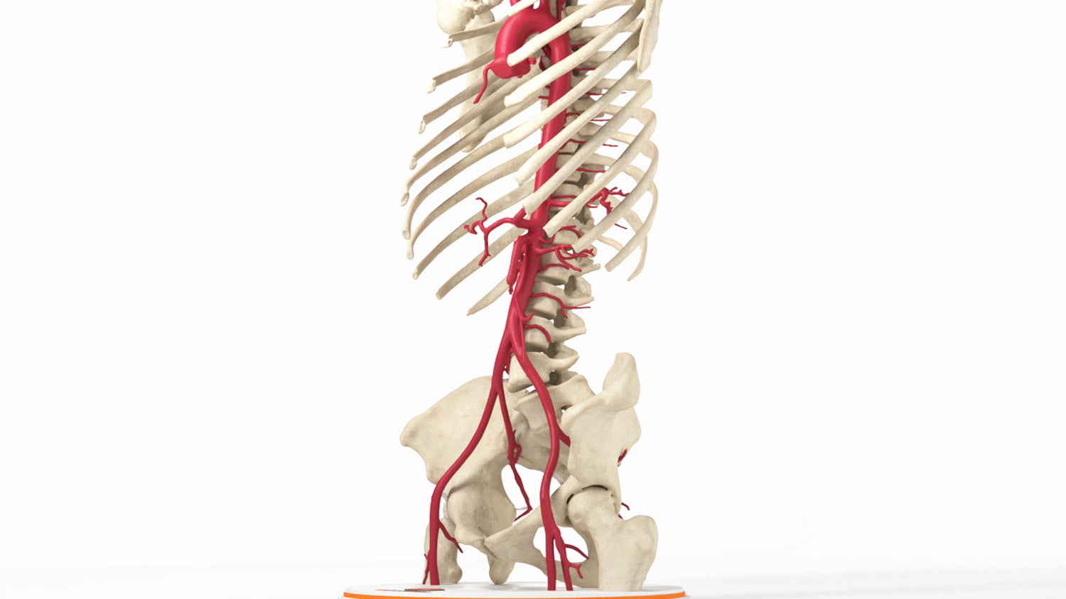 4. Aortic bifurcation: The aorta terminates at L4, bifurcating into the right and left common iliac arteries. Each common iliac artery further branches into the Internal Iliac Artery, which supplies the pelvic organs, and the External Iliac Artery, which continues into the lower limb as the Femoral Artery, providing circulation to the legs and feet.