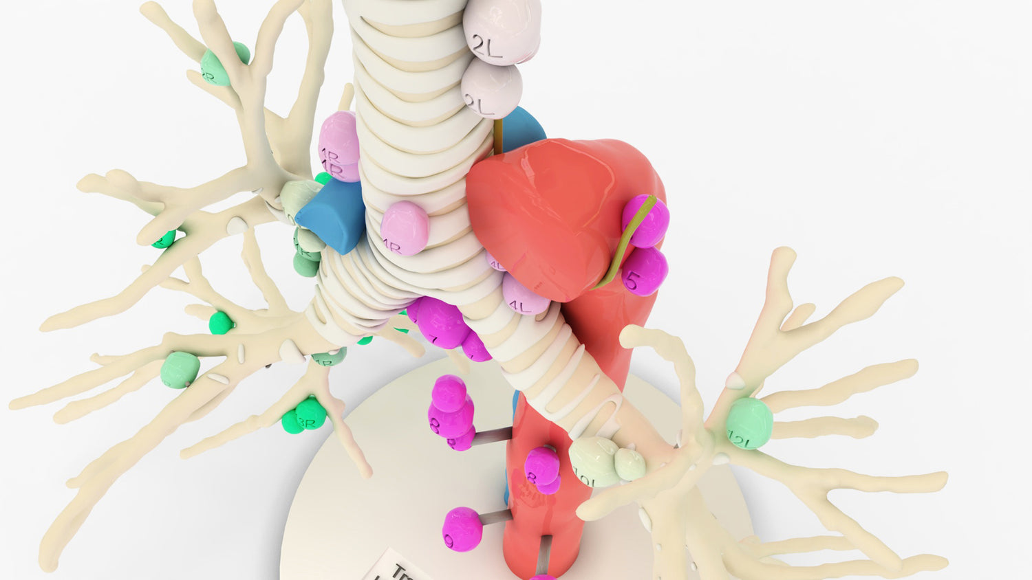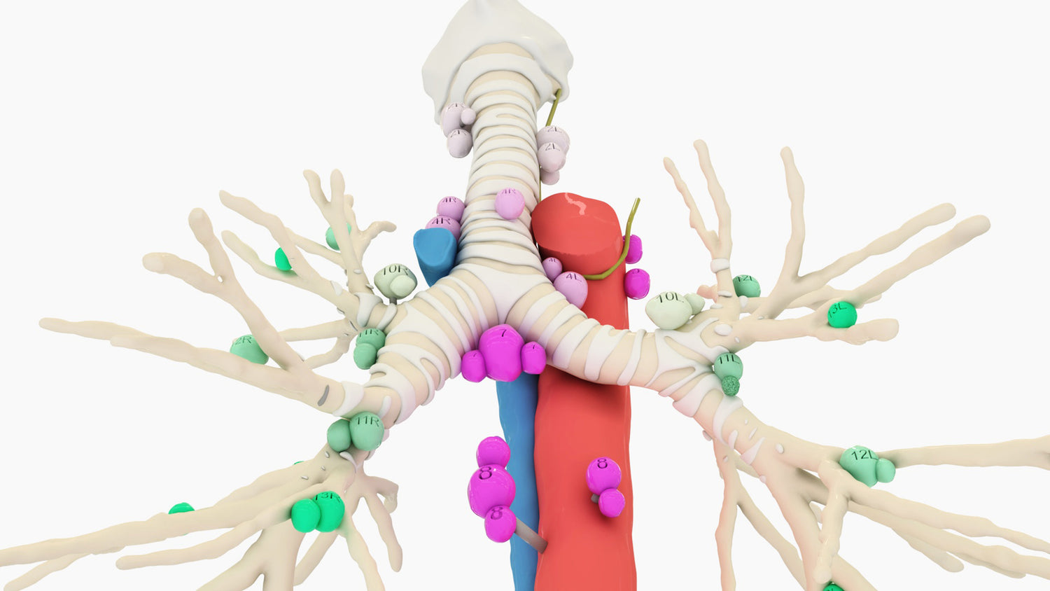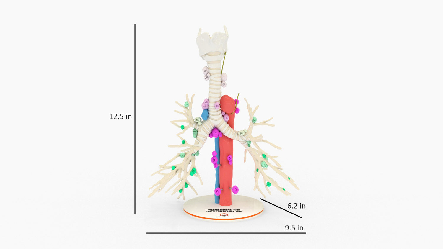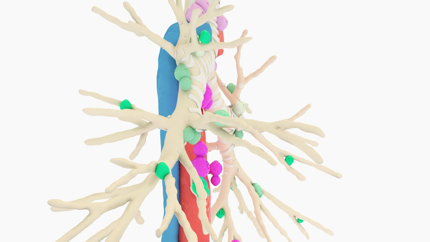 Tracheobronchial tree showing the system of airways that enable gas exchange in the lungs. Includes trachea, right and left main bronchi, lobar bronchi, and segmental bronchi. The lungs include the right upper, middle, and lower lobes, and the left upper and lower lobes. Includes labeled lymph node levels for anatomical reference for surgical training of thoracic surgeons.