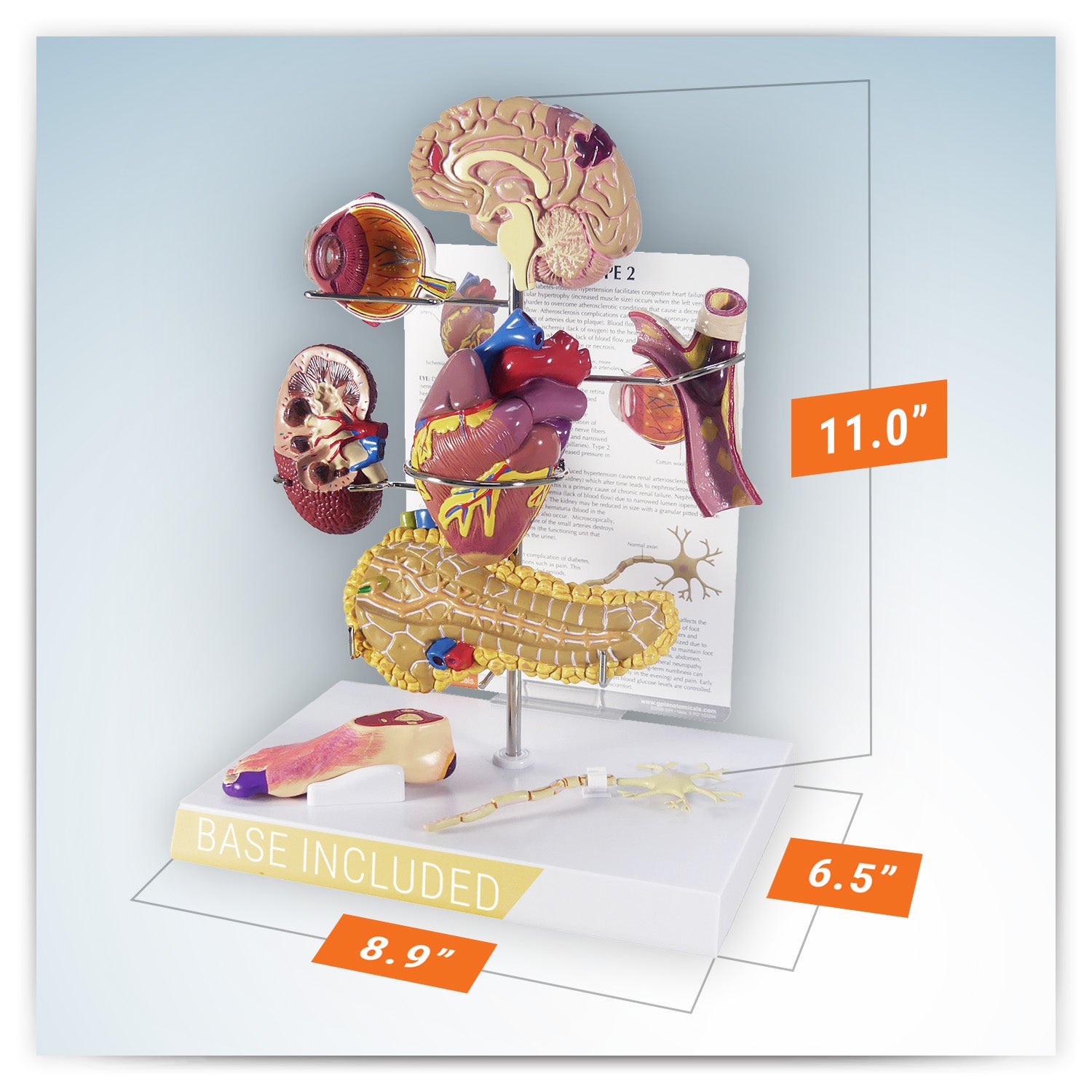 This miniature set includes brain, eye, heart, kidney, artery, pancreas, neuron, & foot models. The card illustrates the effects of Type II Diabetes, including stroke, ocular pathology, heart disease, hardening of the kidney, & more. This product contains a model, an informational card, & display base. The full size of the model measures 9″ x 2″ x 11″. The size of the card measures 6-1/4” x 8-1/4”. The size of the base measures 8-7/8” x 6-1/4”. Our model is great for doctor's offices and healthcare facilities.